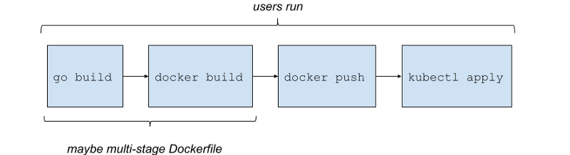 Tools such as skaffold can wrap this process for arbitrary languages and Dockerfiles to make it easier to manage (and faster), but you still need to write artisanal hand-crafted Dockerfiles , and typically need to write more yaml (or other) to tell the tooling how to orchestrate this (e.g. what gets pushed where?):